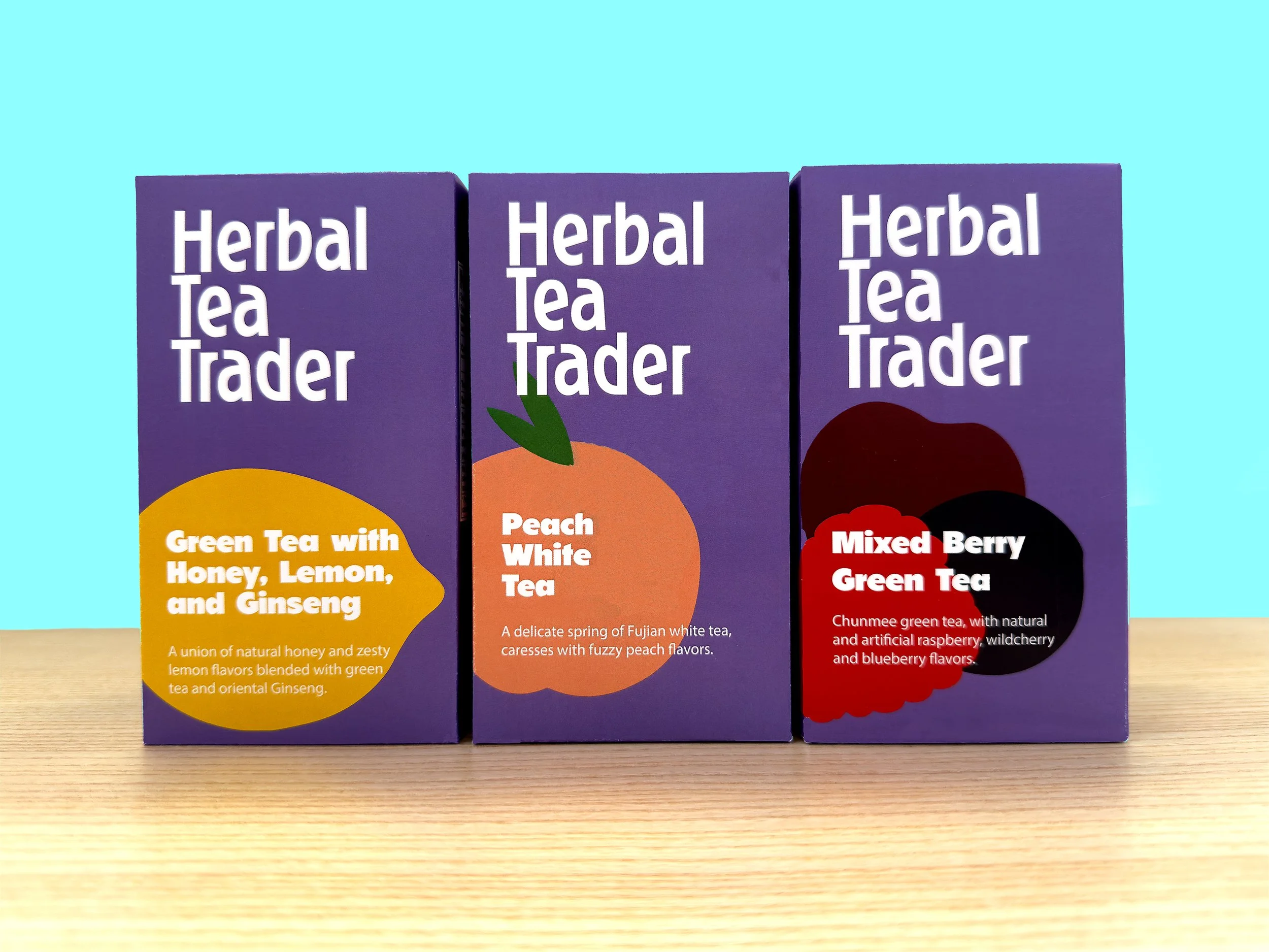 This project involved designing a set of three boxes for a fictional tea company. I used bold illustrations inspired by the main ingredients of each tea, pairing them with a solid purple background to create a striking contrast. The final design is crafted to stand out on supermarket shelves nationwide. The included photo showcases the printed and assembled packaging before undergoing final edits in Photoshop.